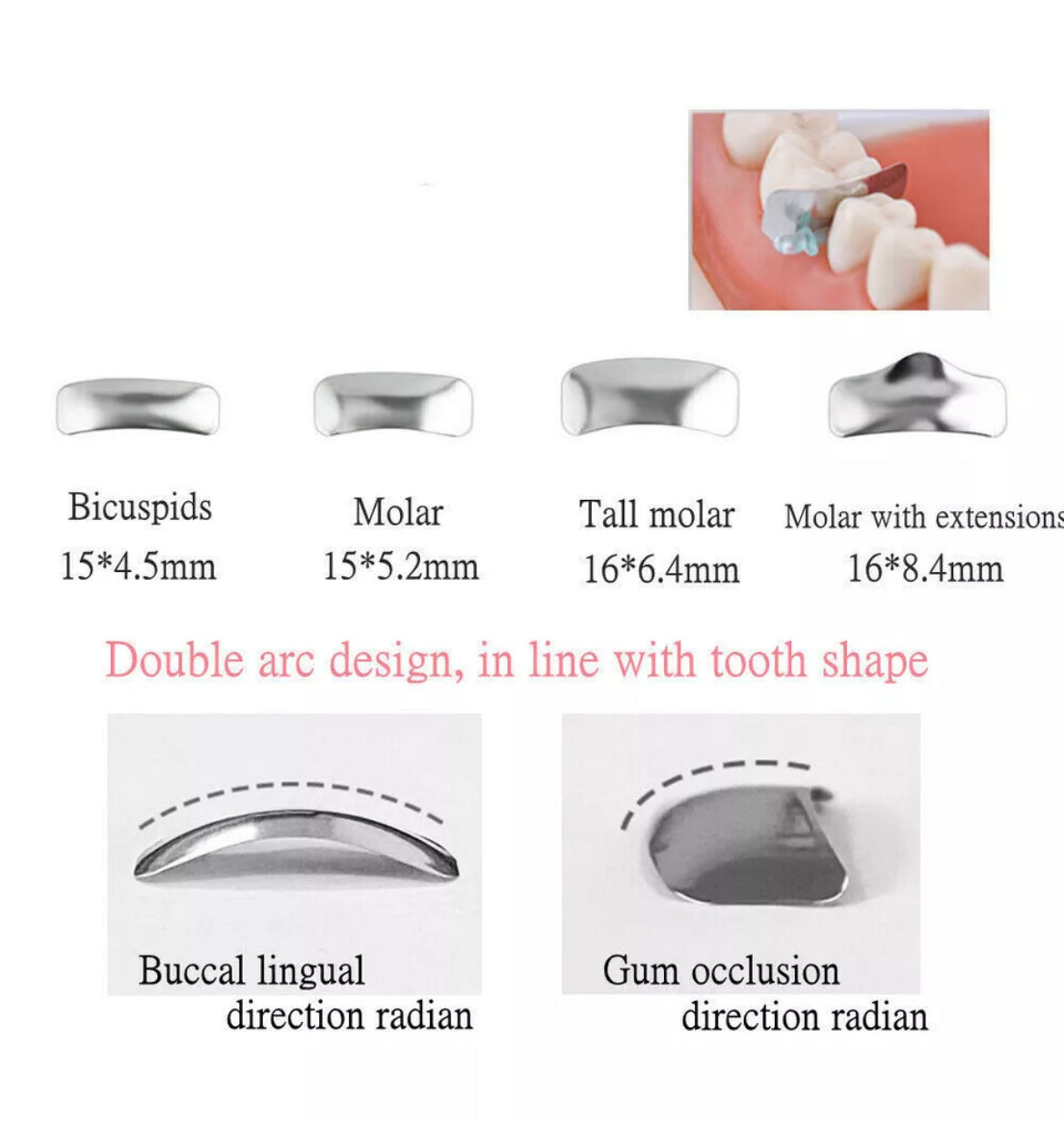 - The double curved design conforms to the anatomical shape of the tooth.